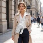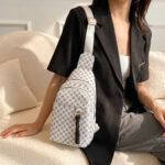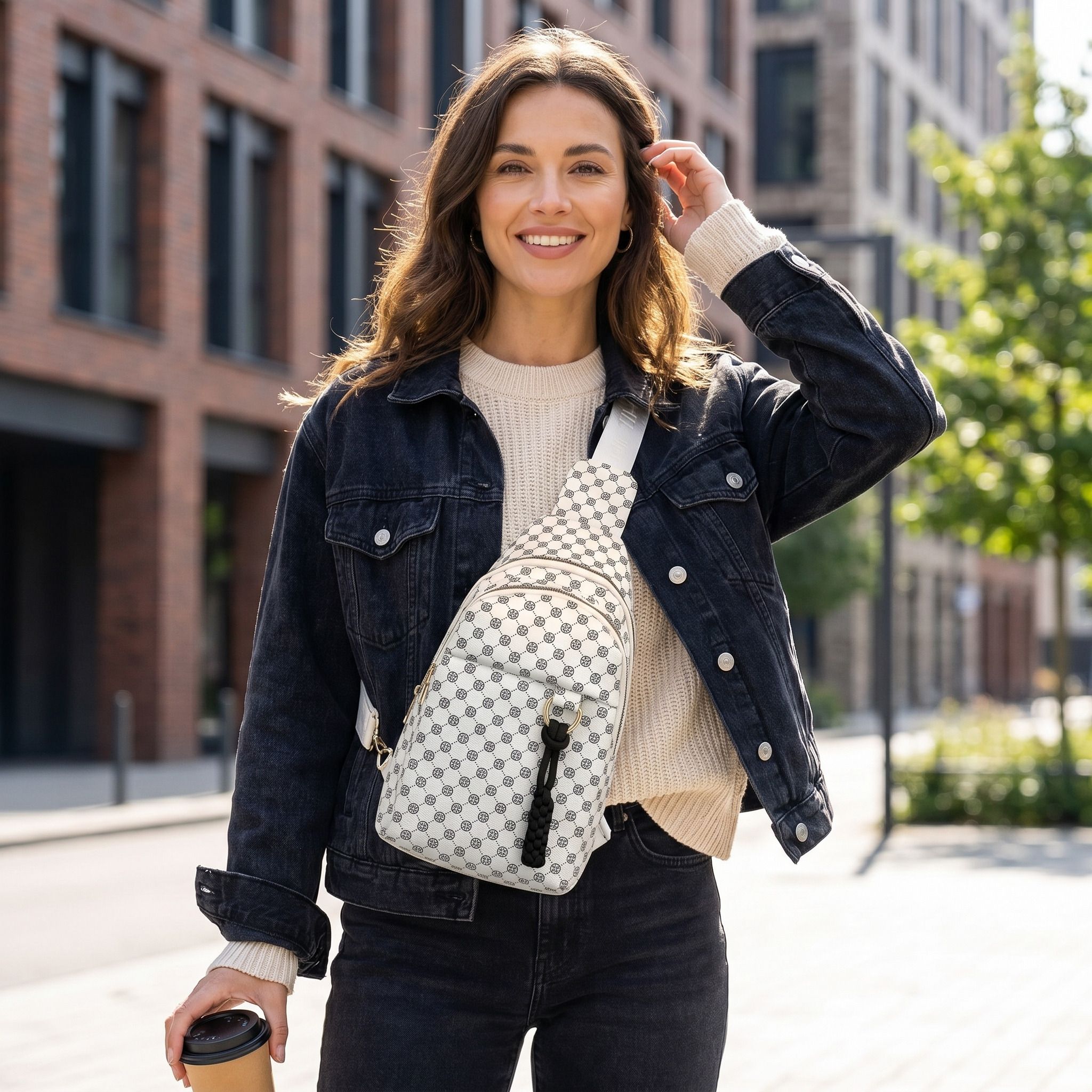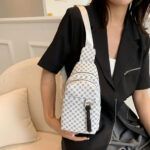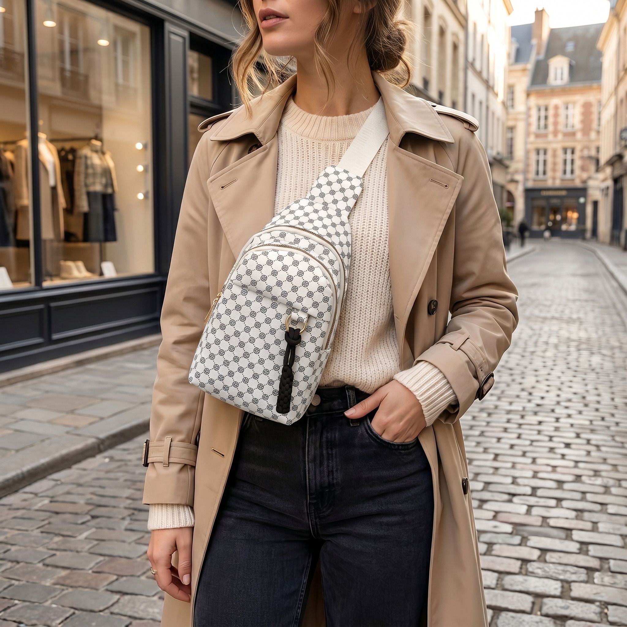 Checkered White Mini Plaid Sling Bag – Compact Crossbody Chest Pack with Front Pocket for Travel, Daily Carry & Streetwear Style