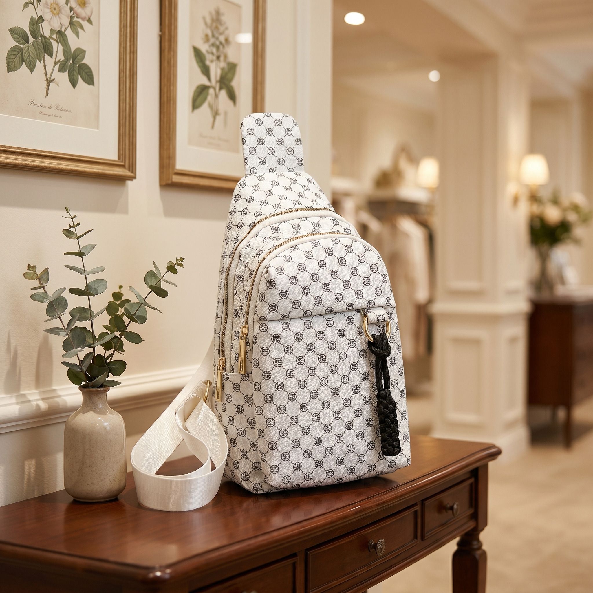 Beige Meixing Luxe Monogram Crossbody Sling Bag – Designer-Inspired Chest Bag with Dual Zipper Pockets