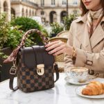 Dark Brown Checkered Crossbody Satchel – Top Handle Vintage Style Bag with Buckle Clasp