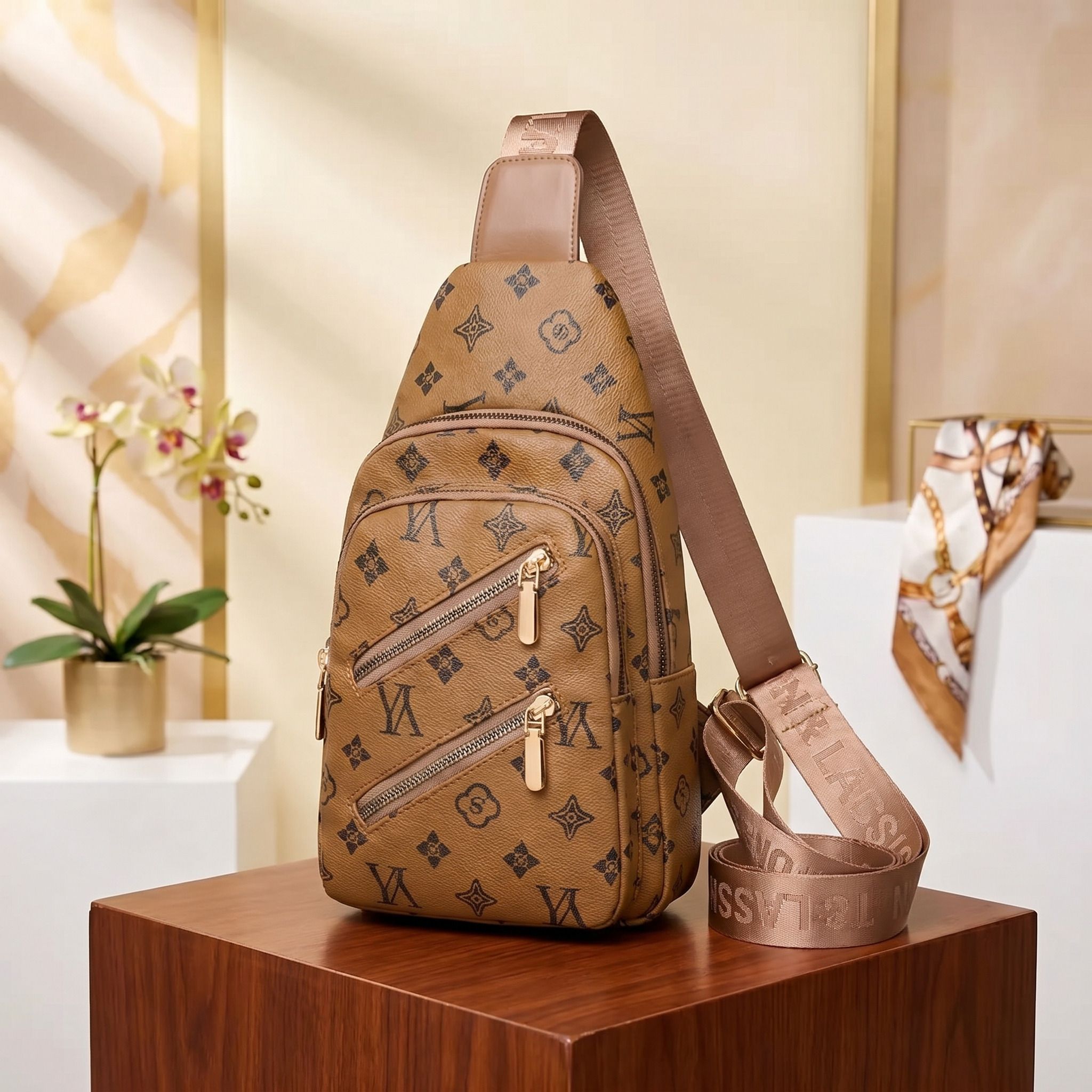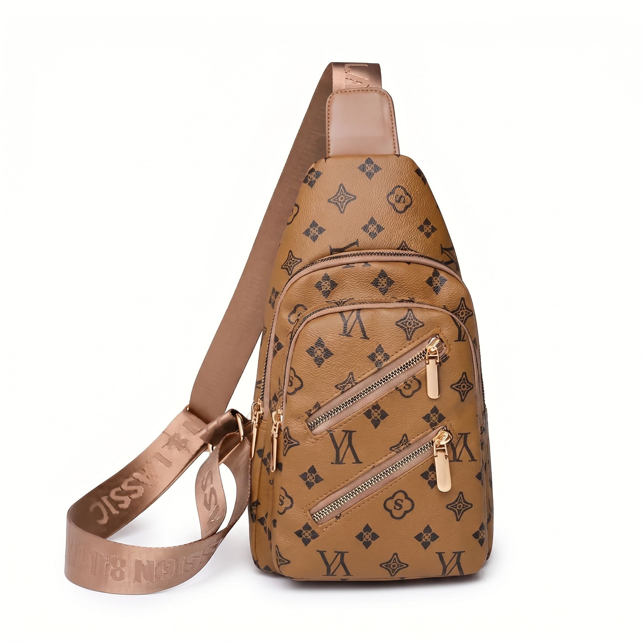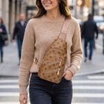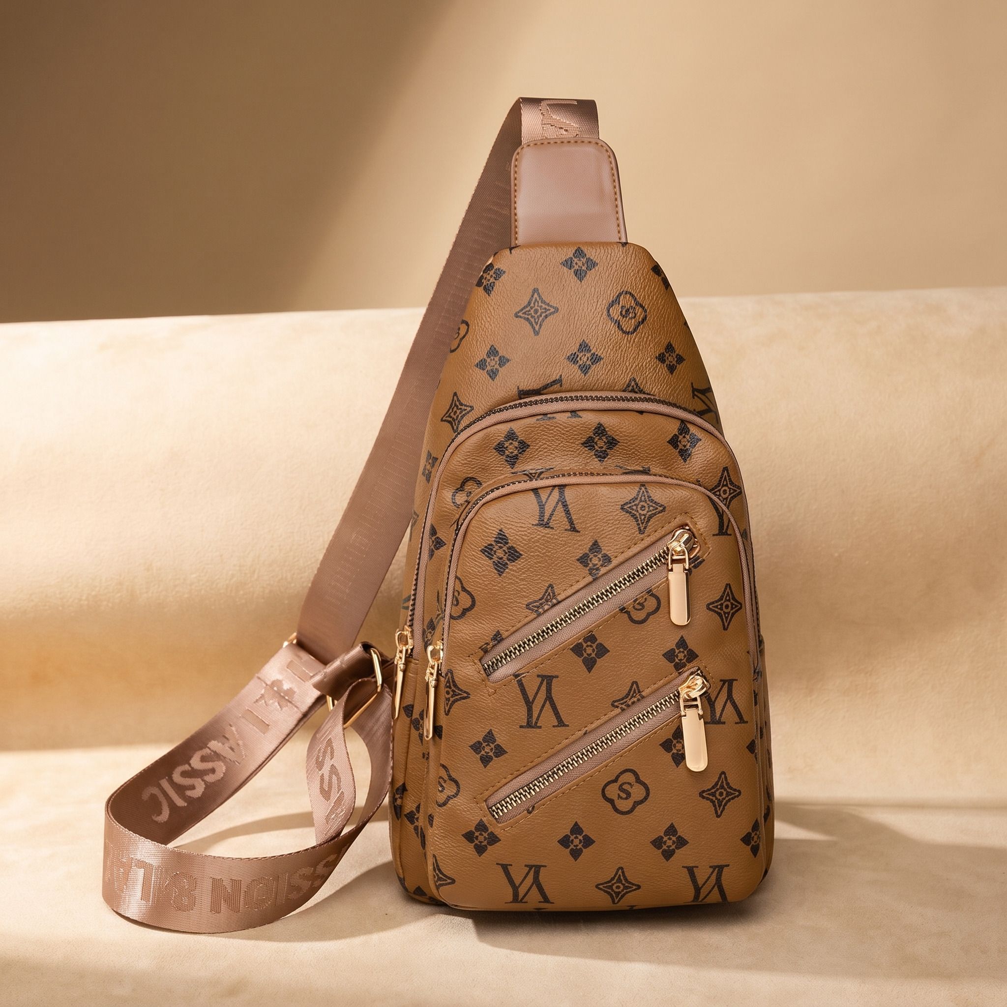 Light Brown Patterned Crossbody Sling Bag – Women’s Chest Bag with Gold Hardware