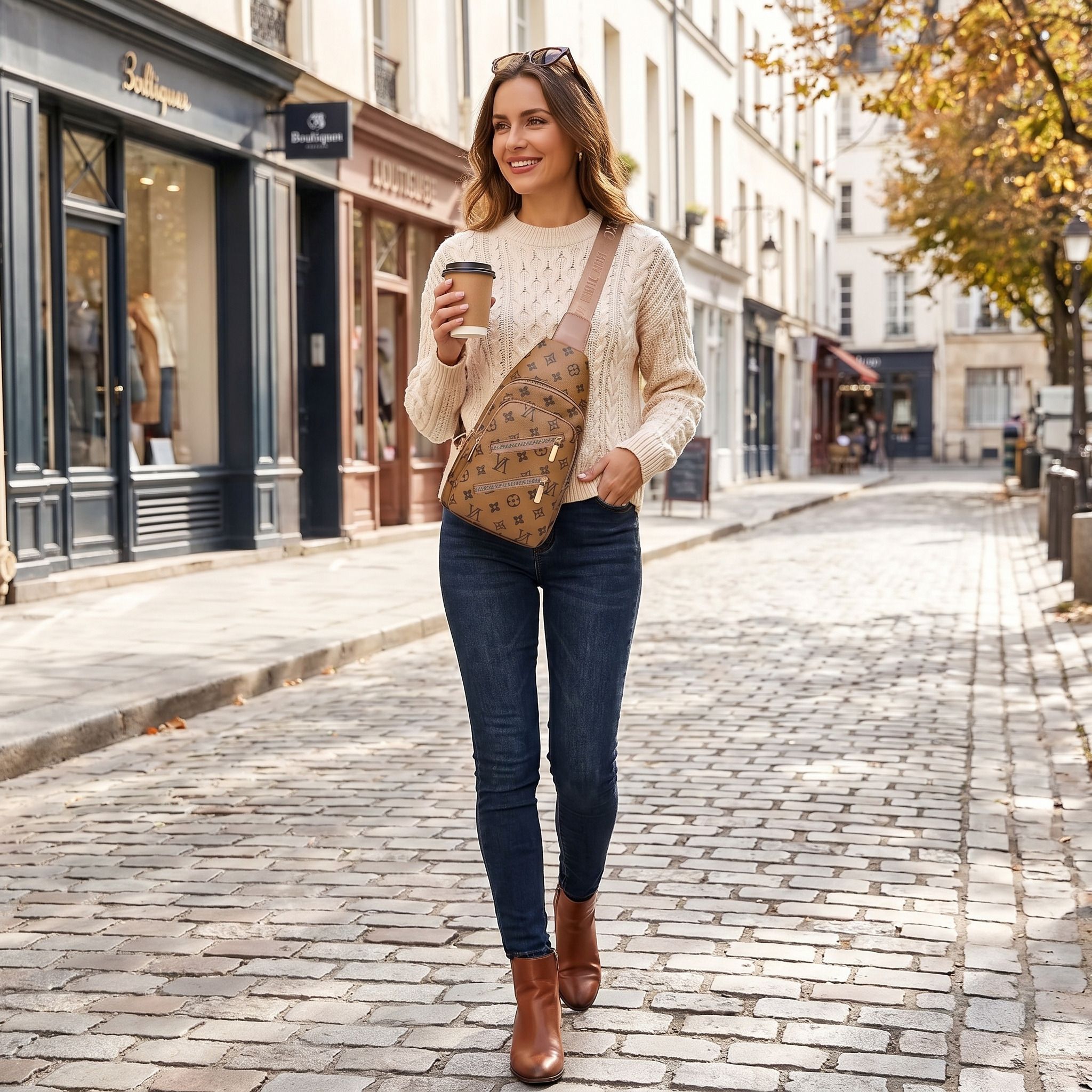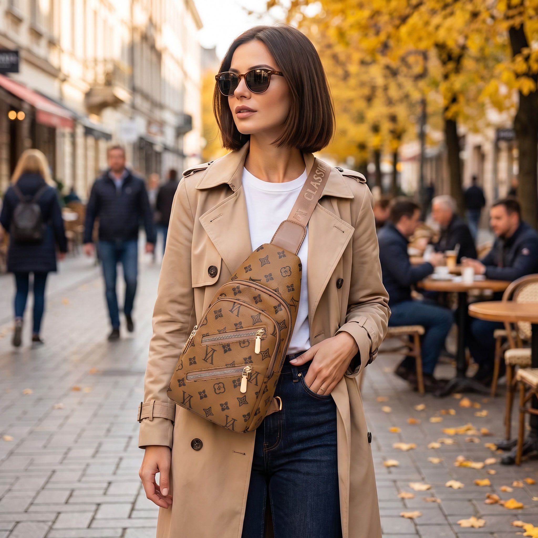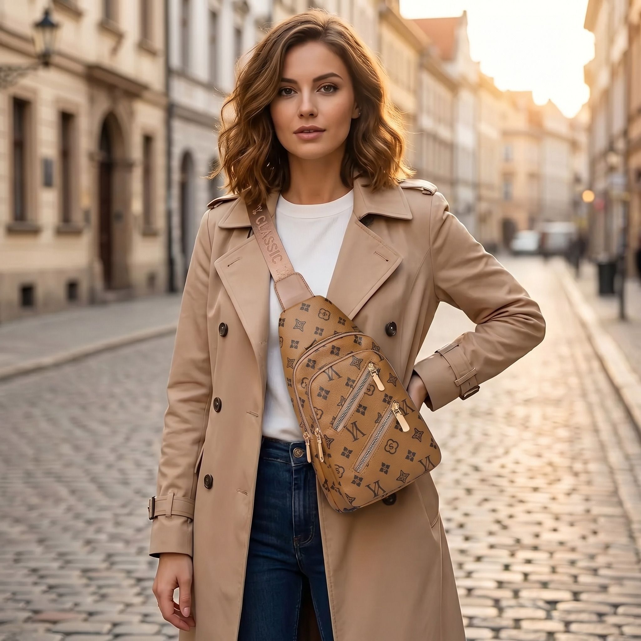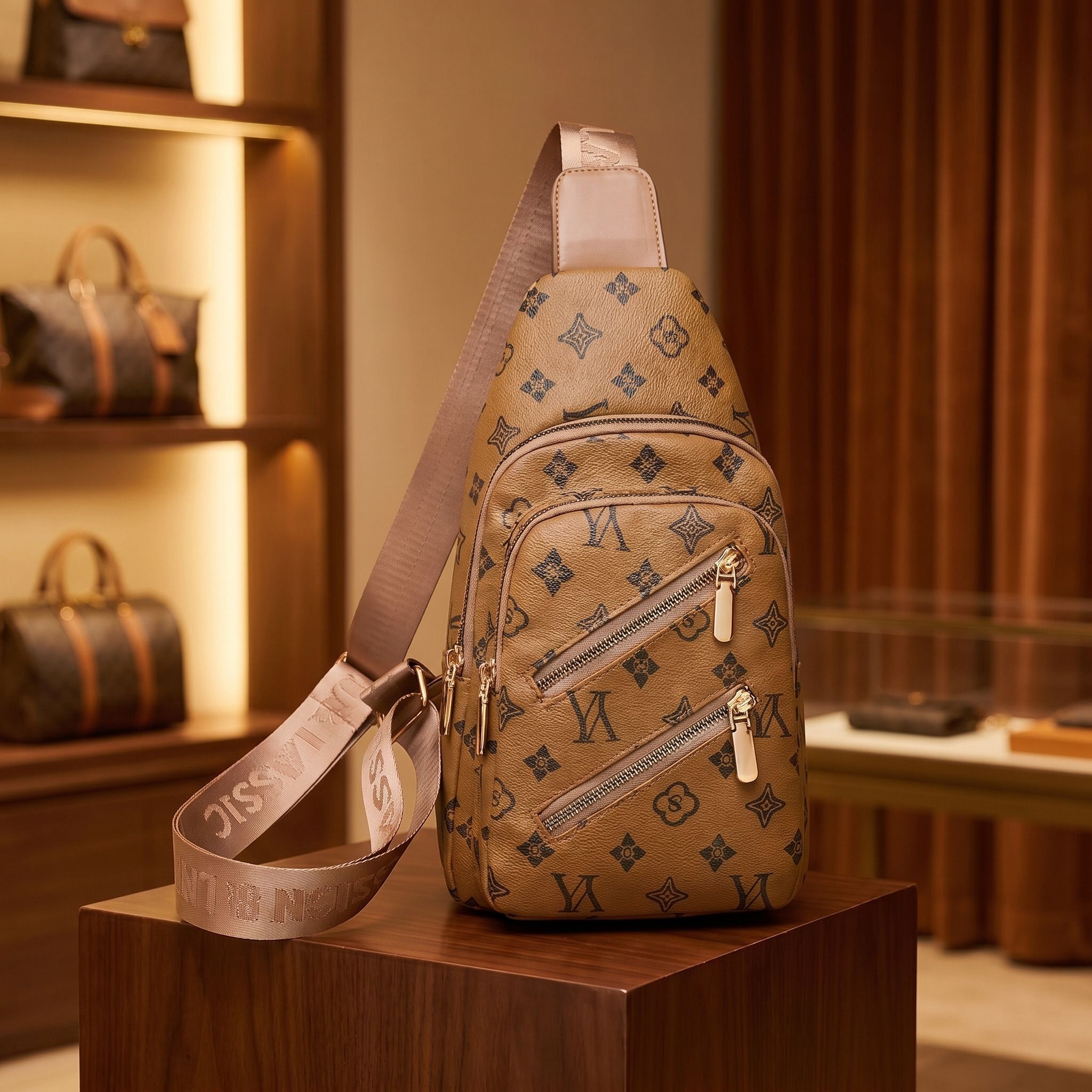 Light Brown Patterned Crossbody Sling Bag – Women’s Chest Bag with Gold Hardware