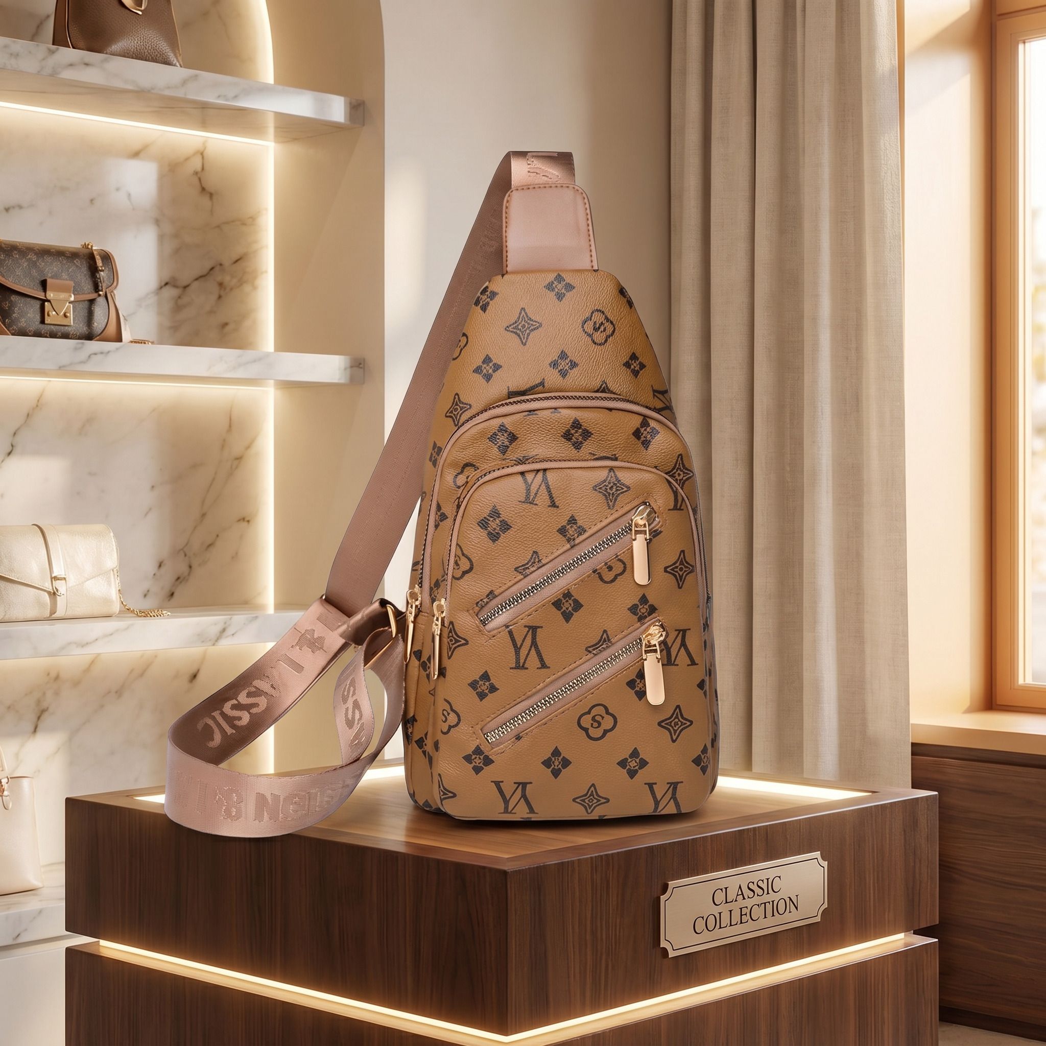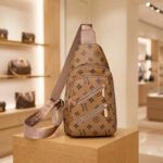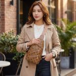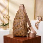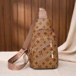 Home Sling Bags Light Brown Patterned Crossbody Sling Bag – Women’s Chest Bag with Gold Hardware