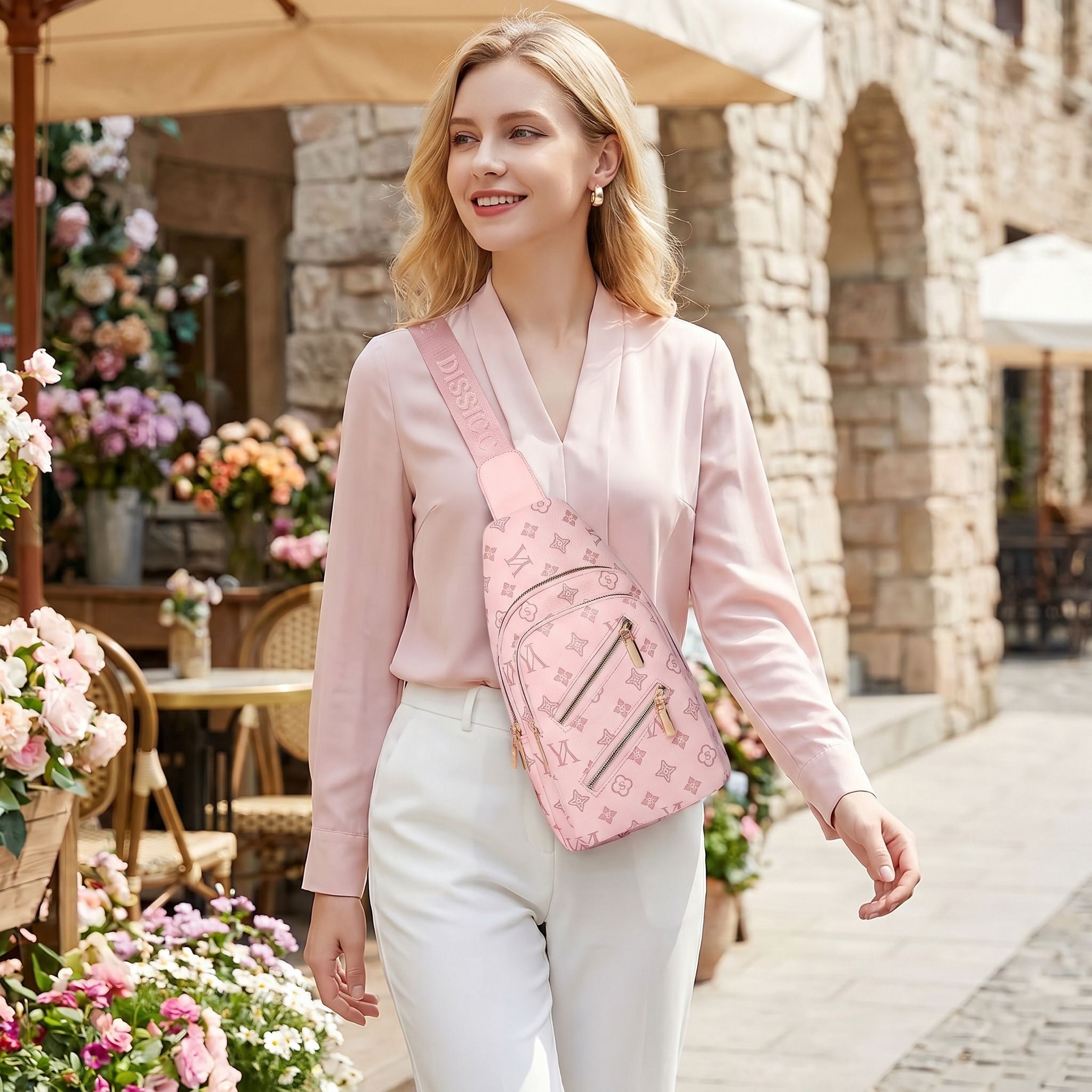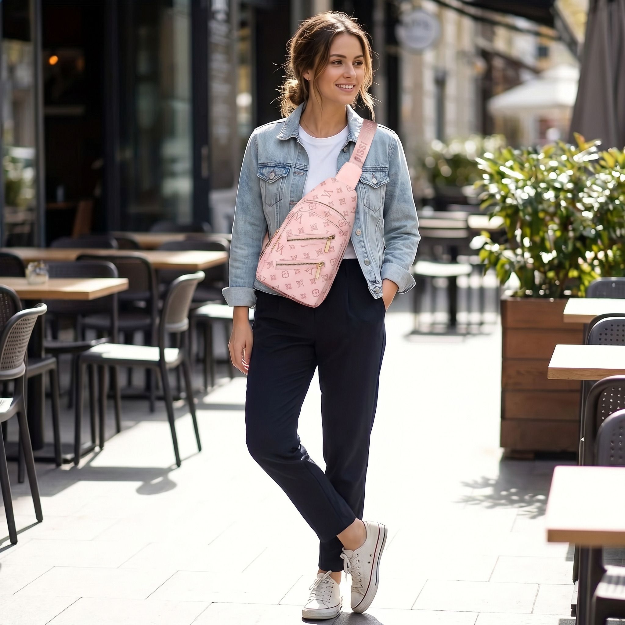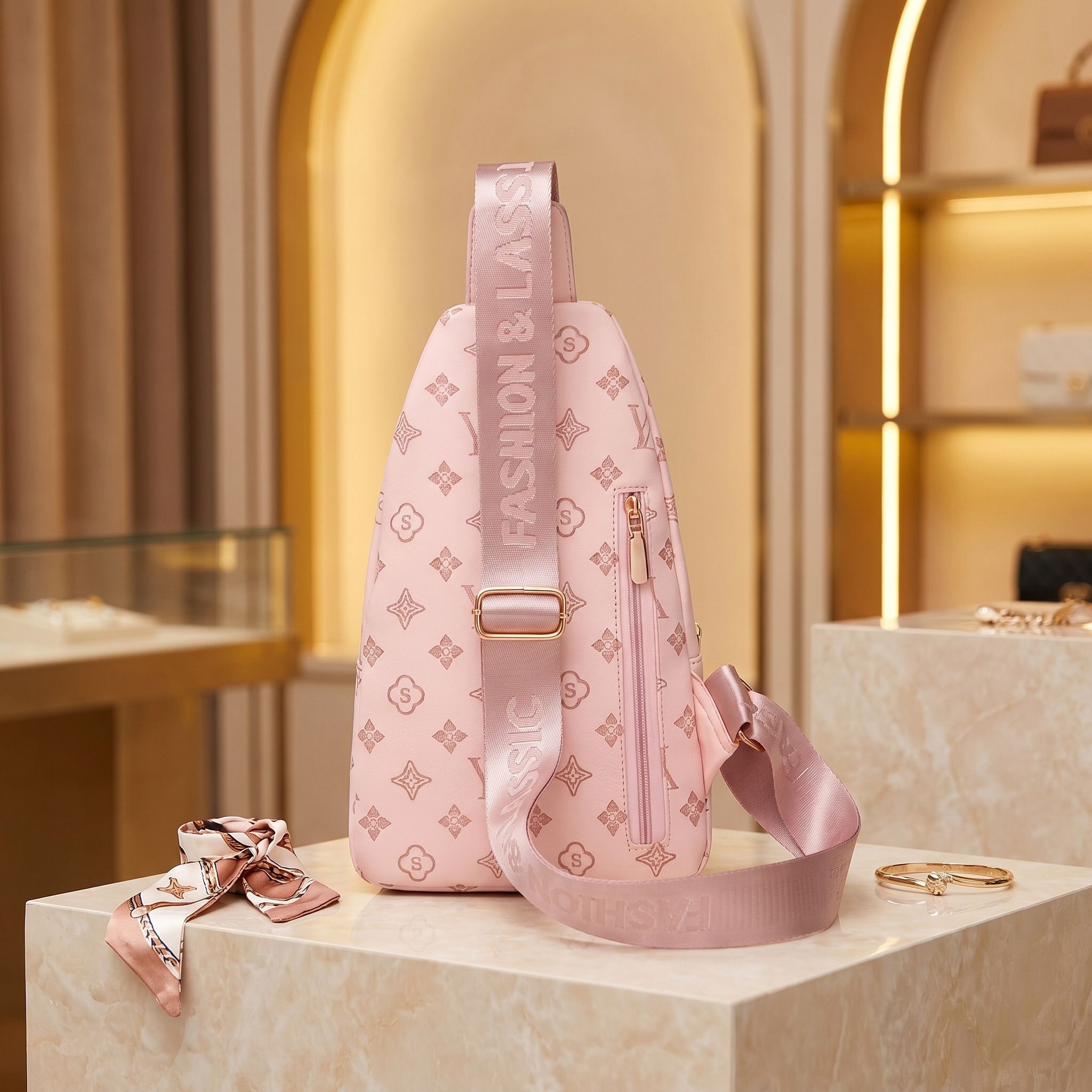 Add a soft, stylish touch to your outfit with this Pink Sling Bag. Featuring a trendy patterned design and elegant gold hardware, this bag is perfect for everyday wear while keeping your essentials secure and accessible.