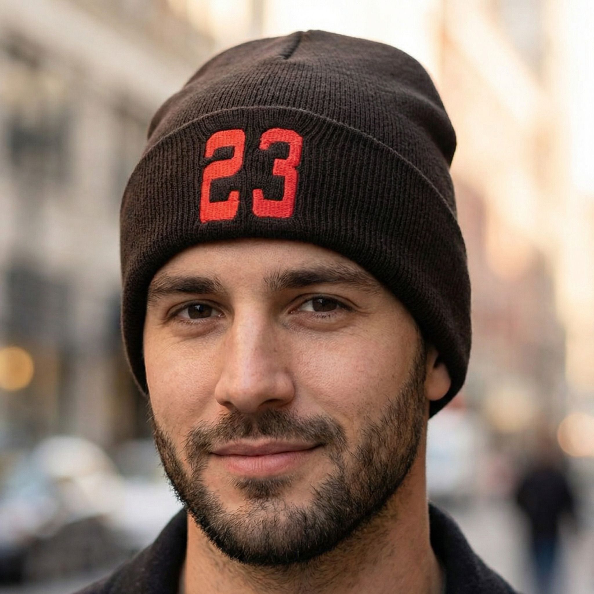Level up your everyday fit with this unisex brown knit beanie featuring a bold “23” graphic. Designed for all-season wear, it’s made with a soft, breathable knit that delivers comfort without the bulk. The cuffed style provides a secure fit while adding a clean streetwear edge. Easy to style and built for daily use, this beanie pairs effortlessly with casual, urban, and layered looks. Whether you’re out on the move or finishing off your outfit, it’s a go-to accessory that brings attitude and comfort together.