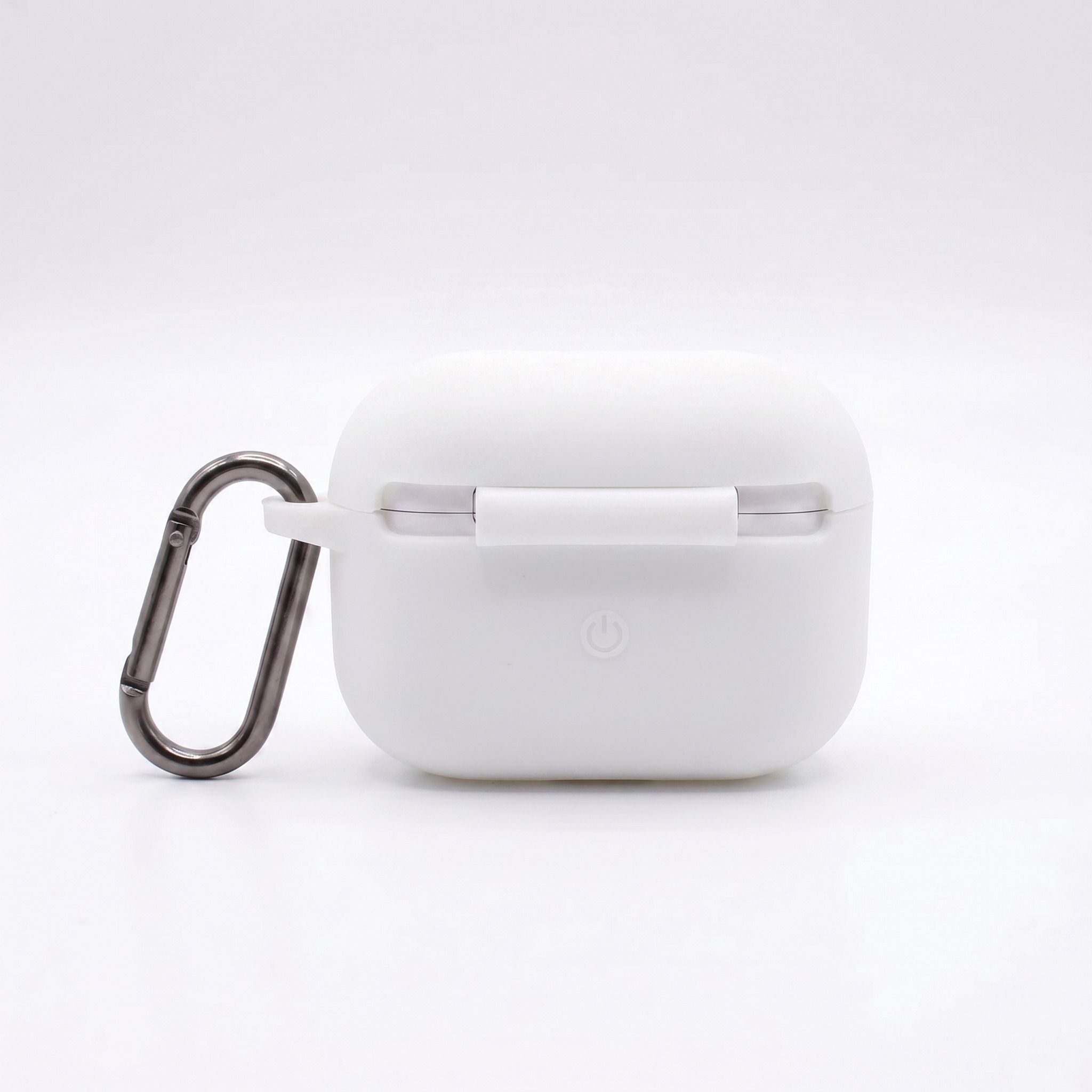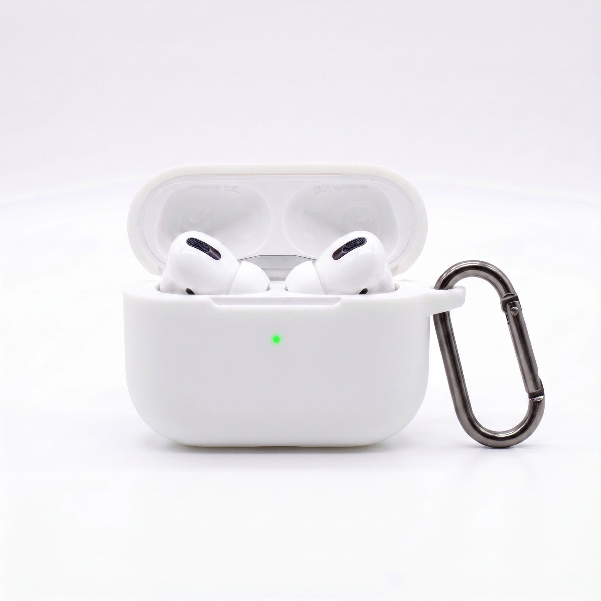 White Flat Base Silicone Case for AirPods Pro & Pro 2 – Stable Bottom Cover with Gray Carabiner