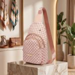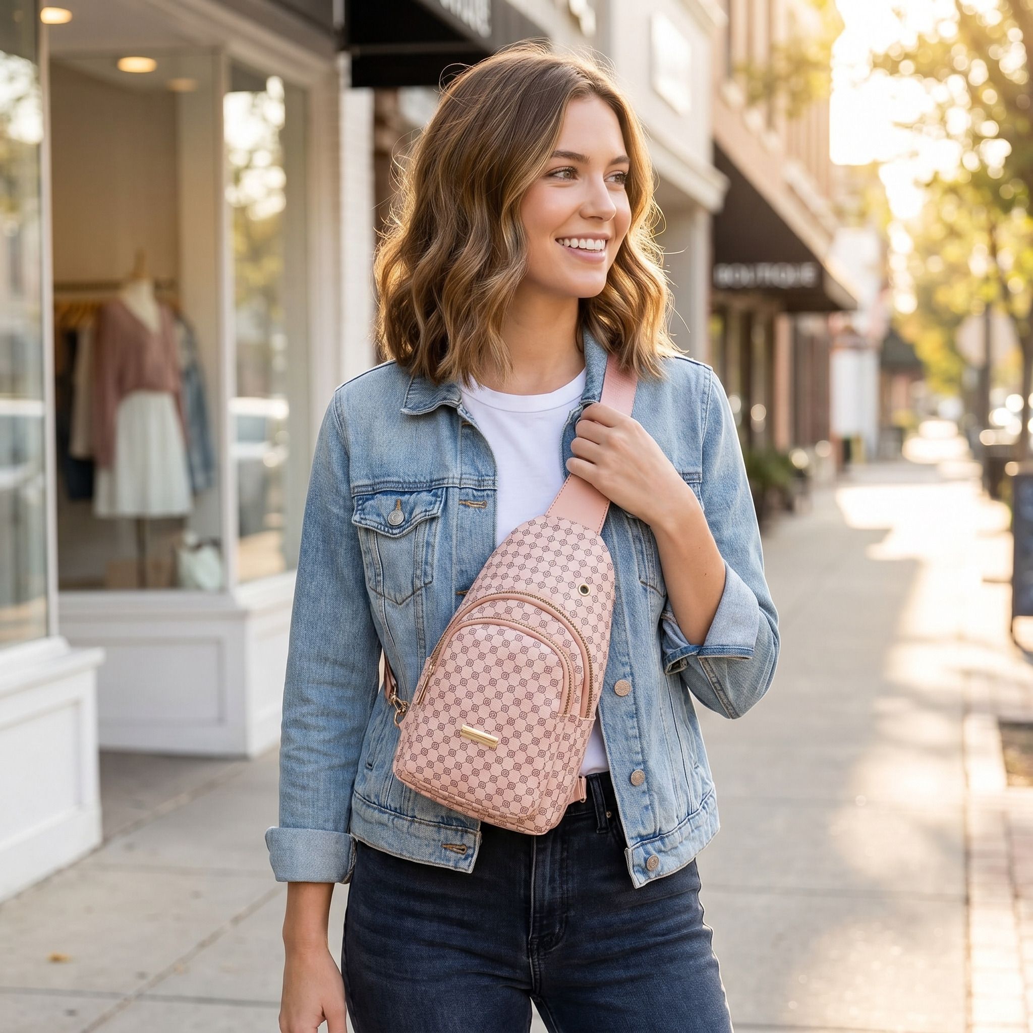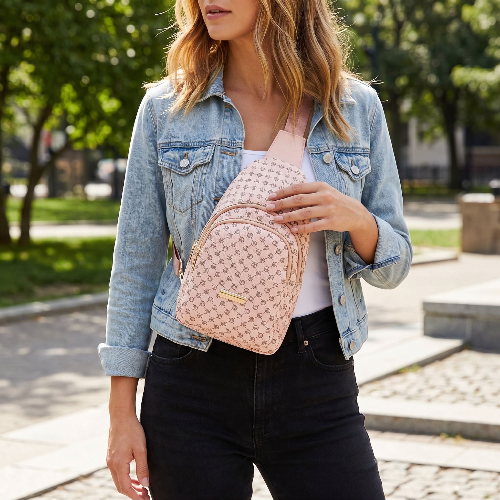 Pink Patterned Crossbody Sling Bag – Women’s Chest Bag with Gold Hardware